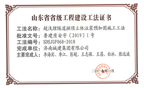 集團(tuán)“超淺埋隧道拱頂土體注漿預(yù)加固施工工法”被評為山東省省級工程建設(shè)工法