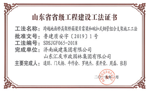 集團(tuán)“跨越地面橋高架橋箱梁貝雷梁和碗扣式鋼管組合支架施工工法”被評為山東省省級工程建設(shè)工法