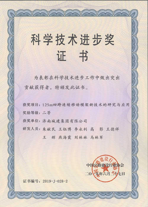 集團(tuán)《125m四跨連續(xù)移動(dòng)模架新技術(shù)的研究與應(yīng)用》榮獲“科學(xué)技術(shù)進(jìn)步獎(jiǎng)二等獎(jiǎng)”