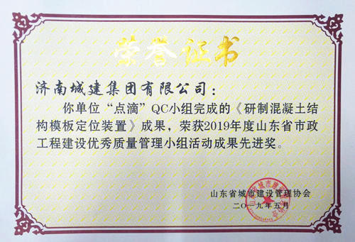 集團(tuán)“點(diǎn)滴”QC小組完成的《研制混凝土結(jié)構(gòu)模板定位裝置》成果榮獲“2019年度山東省市政工程建設(shè)優(yōu)秀質(zhì)量管理小組活動(dòng)成果先進(jìn)獎(jiǎng)