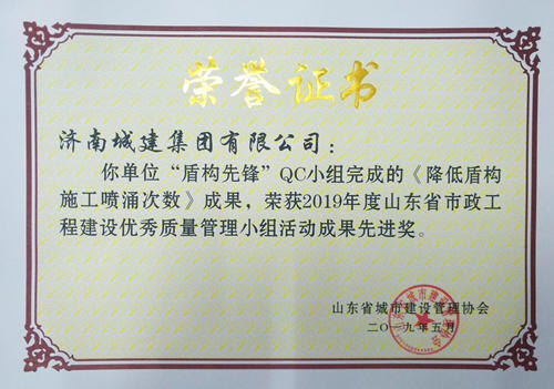 集團“盾構先鋒”QC小組完成的《降低盾構施工噴涌次數(shù)》成果榮獲“2019年度山東省市政工程建設優(yōu)秀質量管理小組活動成果先進獎