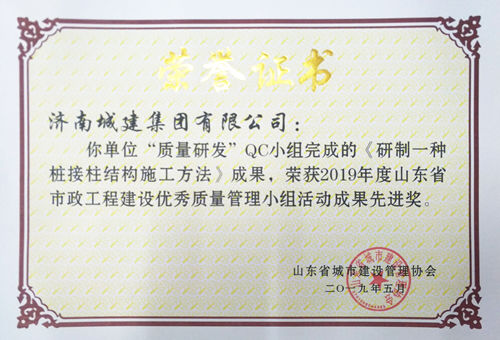 集團“質量研發(fā)”QC小組完成的《研制一種樁柱結構施工方法》成果榮獲“2019年度山東省市政工程建設優(yōu)秀質量管理小組活動成果先進獎