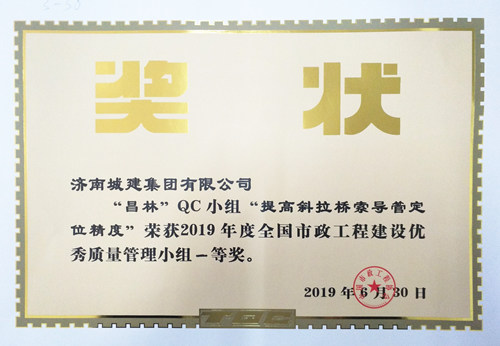 集團(tuán)“昌林”QC小組《提高斜拉橋索導(dǎo)管定位精度》榮獲“2019年度全國市政工程建設(shè)優(yōu)秀質(zhì)量管理小組一等獎”