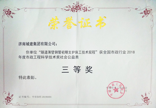 集團(tuán)《隧道薄壁鋼管初期支護(hù)施工技術(shù)規(guī)程》榮獲“2018年度市政工程科學(xué)技術(shù)獎(jiǎng)社會(huì)公益類三等獎(jiǎng)”