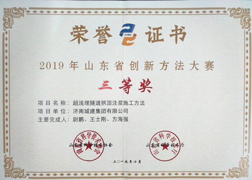 集團(tuán)《超淺埋隧道拱頂注漿施工方法》榮獲“2019年度山東省創(chuàng)新方法大賽三等獎(jiǎng)”