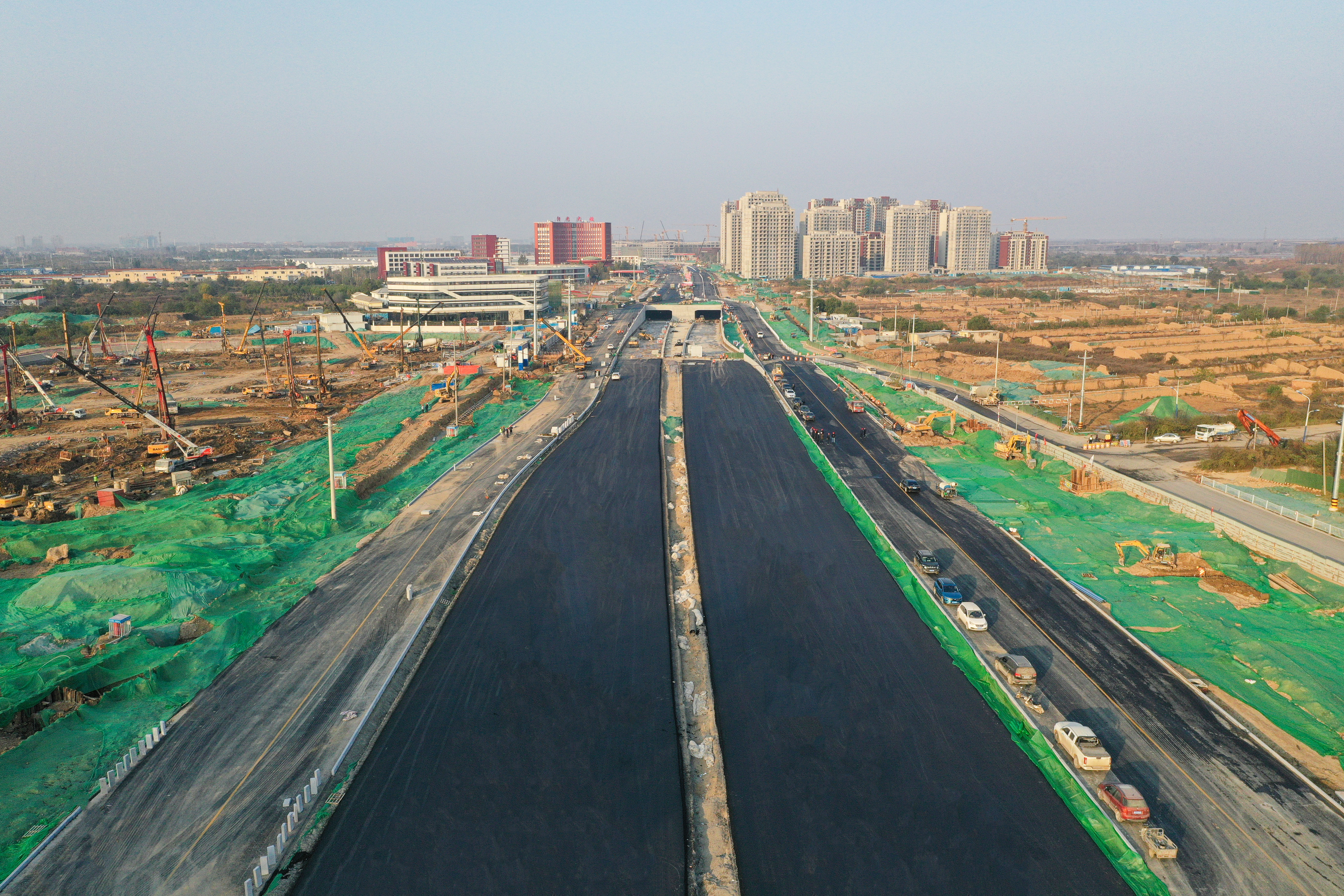 黃河大道自大橋組團(tuán)西邊界向北延伸,全長21.8km,建成后的黃河大道將串聯(lián)3大組團(tuán)、5處重點(diǎn)片區(qū),銜接起包括建成、在建和規(guī)劃建設(shè)的10條過黃通道。集團(tuán)承建的一期工程第三標(biāo)段,全長約3.5公里,其中地道長度2.34km,施工內(nèi)容包括會展中心地道及配套建筑、地面道路、慢行通道、排水、再生水、綜合管線、人行天橋、照明、交通等。該工程工期緊、施工內(nèi)容和地質(zhì)復(fù)雜、工程體量大、交叉作業(yè)多,堪稱全線最復(fù)雜的標(biāo)段。在市委市政府和市直有關(guān)部門,以及上級主管部門領(lǐng)導(dǎo)的關(guān)心和支持下,集團(tuán)將黃河大道工程作為一號工程,集聚優(yōu)勢力量,發(fā)揮大兵團(tuán)作戰(zhàn)優(yōu)勢,領(lǐng)導(dǎo)靠前指揮,業(yè)務(wù)部室全程參與監(jiān)督調(diào)度,狠抓工程質(zhì)量、安全、文明施工及進(jìn)度,歷經(jīng)8個多月奮戰(zhàn),地道結(jié)構(gòu)部分全部完成,實(shí)現(xiàn)了快車道臨時通車。目前,正加快推進(jìn)地面道路附屬設(shè)施、地道內(nèi)裝飾裝修的施工。