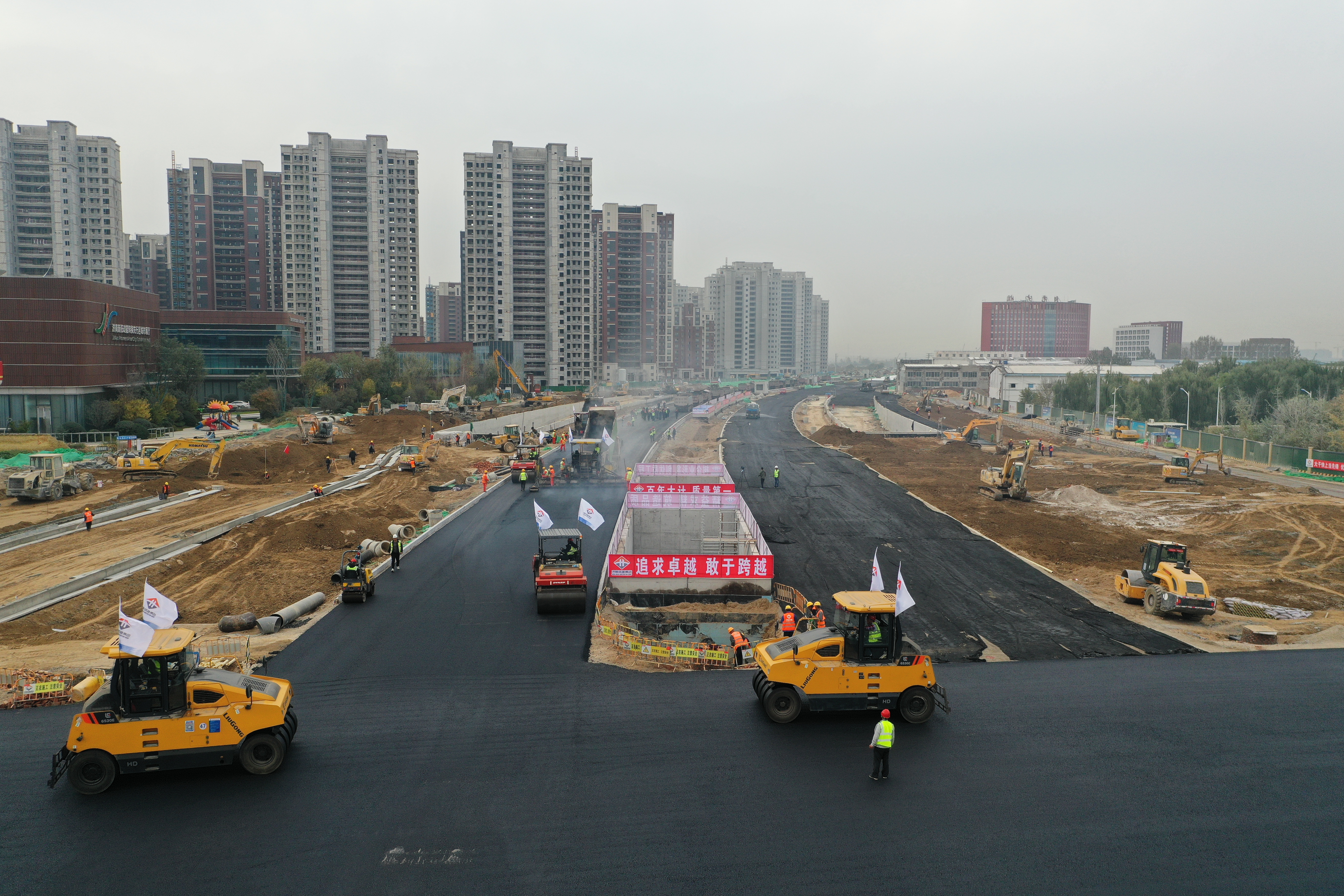 黃河大道不僅工期緊、工程量大,施工組織難度等任務(wù)非常艱巨。利用兩個月的時間完成160萬立方米地道基坑土方開挖約,相當(dāng)于開挖兩個大明湖的方量,嚴(yán)格執(zhí)行環(huán)保標(biāo)準(zhǔn)要求,強(qiáng)化揚(yáng)塵管控,完成鋼筋制安8.6萬噸,澆筑混凝土43.9萬立方米,地面道路水穩(wěn)18萬噸,瀝青12萬噸;同時,為保障工程深基坑、塔吊、支架模板、大體積混凝土澆筑等施工方案可行性,集團(tuán)指揮部邀請相關(guān)專家進(jìn)行專項論證,施工中統(tǒng)一調(diào)度、反復(fù)優(yōu)化。集團(tuán)項目部針對各工區(qū)施工任務(wù)和難點(diǎn),科學(xué)制定施工計劃,合理調(diào)配作業(yè)機(jī)械,組織集中優(yōu)勢力量,迎難而上、強(qiáng)力攻堅、苦干實(shí)干,逐一攻克施工難點(diǎn)重點(diǎn),成功破解一個又一個施工難點(diǎn),為項目如期推進(jìn)保駕護(hù)航。